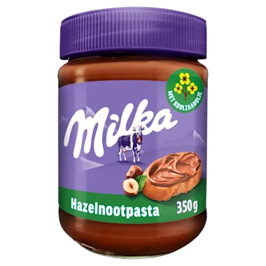 Zachte hazelnootpasta met de typische Milka smaak en makkelijk smeerbaar. Deze heerlijk romige chocopasta wordt jouw nieuwe favoriete beleg! Smeerpasta gemaakt met koolzaadolie en zonder kunstmatige kleurstoffen. Milka bestaat al sinds 1901 en de naam is een samenvoeging van de belangrijkste ingredienten, melk en cacao. Sinds het begin is de verpakking paars en sinds 1964 is lila onze merkkleur. Sinds de jaren 1970 herken je onze chocola ook via de bekende Milka-koe.