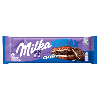 Ontdek de extra grote reep Milka MMMax Oreo: een hele Oreo koek bedekt met een dubbele crèmelaag, omhuld met Milka Alpenmelkchocolade. Dankzij de hersluitbare verpakking geniet je extra lang van de heerlijke chocola. Milka bestaat al sinds 1901 en de naam is een samenvoeging van de belangrijkste ingrediënten, melk en cacao. Sinds het begin is de verpakking paars en sinds 1964 is lila onze merkkleur. Sinds de jaren 1970 herken je onze chocola ook via de bekende Milka-koe.