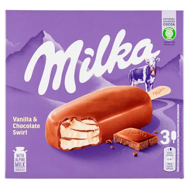 Vanille ijs met een bereiding van melkchocolade (met Alpenmelk) 7% omringd met melkchocolade (met Alpenmelk) 31%. [melkchocolade ten minste 25% cacaobestanddelen].