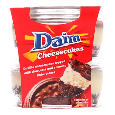 Dessert met een bereiding van roomkaas op een laag van cacaobiscuit 23% met een topping van melkchocolade 11% en stukjes karamel en amandelen bedekt met chocolade 5,8%. Ontdooid.