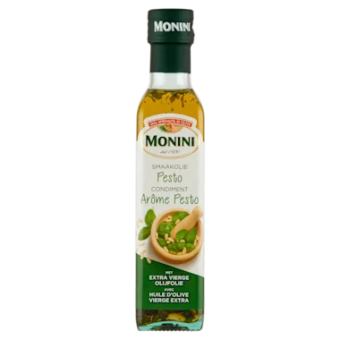 Ingrediënten: Extra vierge olijfolie (98%), aroma (1%), pijnboompitten (0,9%), basilicum (0,1%). Kan sporen bevatten van PINDA's, SOJA, NOTEN en LACTOSE.