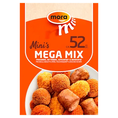 Ingrediënten: Frikandel: mechanisch gesepareerd kippenvlees 47%, water, varkensvlees 14%, paneermeel (TARWEbloem, zout, gist, water), varkensvet, zout, ui, specerijen, dextrose, glucosestroop, groentepoeder (ui, knoflook), emulgatoren: E450 en E452, gistextract, antioxidanten: ascorbinezuur en citroenzuur, maltodextrine, gehydrolyseerd TARWE-eiwit, natuurlijk aroma, EI. Bitterbal: water, TARWEbloem, paneermeel (TARWEbloem, zout, gist, water), plantaardige oliën (palm, zonnebloem), gekookt rundvlees 5%, zout, natuurlijk aroma (bevat SELDERIJ), rundergelatine, TARWE-eiwit, TARWEzetmeel, TARWEgluten, groentepoeder (ui, knoflook), kleurstoffen: karamel en E150d, kruid, specerijen, rundereiwit, dextrose, emulgatoren: E450 en E452, verdikkingsmiddelen: guarpitmeel en xanthaangom. Kipkantje: mechanisch gesepareerd kippenvlees 29%, water, kippencollageen, plantaardige oliën (palm, raapzaad), cornflakes (maïs, GERSTEmoutextract, suiker, zout), paneermeel (TARWEbloem, zout, gist, water), bloem (TARWE, ROGGE), SOJA-eiwitconcentraat, zout, groentepoeder (ui, knoflook), gistextract, stabilisatoren: E450 en E451, TARWEzetmeel, natuurlijk aroma, rijsmiddelen: E450 en E500, specerijen, TARWEgluten, WEIpoeder (bevat MELK). Kan sporen van EI bevatten. Bamihapje: gekookte mie 54% (water, harde TARWEgries), paneermeel (TARWEbloem, zout, kleurstof: annatto, gist), water, plantaardige oliën (palm, zonnebloem), ui, doorhaalmiddel (bloem (rijst, TARWE), TARWEzetmeel, zout, TARWEgluten, dextrose), prei, witte kool, paprika, bamikruiden (zout, natuurlijke aroma's (bevat SELDERIJ), dextrose, zetmeel (TARWEzetmeel, aardappelzetmeel), specerijen, kruiden (bevat SELDERIJ), knoflookpoeder, ketjap manis (SOJAsaus (TARWE, zout, SOJA, water SOJAbonen), water, melasse, suiker, gehydrolyseerd SOJA-eiwit, zout, TARWEzetmeel, zoethoutwortelextract, suikerstroop), rundergelatine, sambal oelek (rode peper, zout), water. Kan sporen van PINDA bevatten. "E"-nummers zijn door de EU goedgekeurde hulpstoffen.