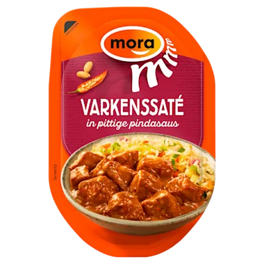 35% gemarineerde, gegaarde varkensblokjes (samengesteld uit stukjes vlees) / 65% pindasaus