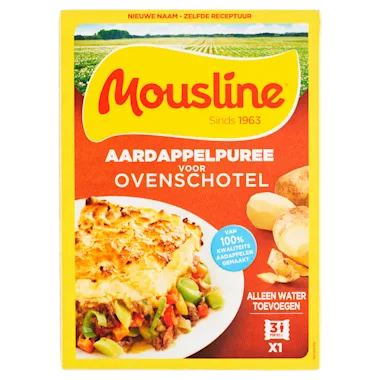 Gebruiksaanwijzing voor 1 zakje. Oven 40 min. 1) Bereid naar eigen smaak groenten en eventueel vlees. Schep deze in een ingevette ovenschaal. Verwarm de oven voor op 200°C graden. 2) Bereid de aardappelpuree: Doe 600ml koud water in een kom en voeg, al roerend met een garde, de inhoud van het zakje aardappelpuree toe. 3) Roer de puree goed door en laat 2 min, staan. roer de puree daarna nogmaals goed door. Zout of boter toevoegen is NIET nodig. 4) Verdeel de puree over de groenten en eventueel vlees. Zet de ovenschotel in de oven gedurende 40 min.