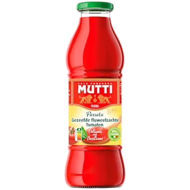 Gezeefde fluweelzachte tomaten met basilicum. De Mutti tomatensaus met basilicum is het resultaat van intens rode en rijpe tomaten die in vol zomer geplukt en verwerkt zijn. Met zorg en savoir-faire wordt een crèmeachtige, homogene saus bekomen, zonder schillen en zaadjes, met een uitnodigende zoetheid, die nog lekkerder ruikt doordat er een blaadje verse basilicum aan toegevoegd is. 100% Italiaans, Tomaten Gecertificeerde Productie.