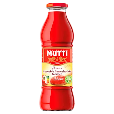 Gezeefde fluweelzachte tomaten. De Mutti Tomatensaus is het resultaat van meer intens rode en rijpe tomaten, die in volle zomer geplukt en onmiddellijk verwerkt zijn. Met zorg en savoir-faire wordt een crèmeachtige, homogene saus bekomen, zonder schillen en zaadjes, en met een uitnodigende zoetheid. 100% Italiaans, Tomaten en Gecertificeerde Productie.