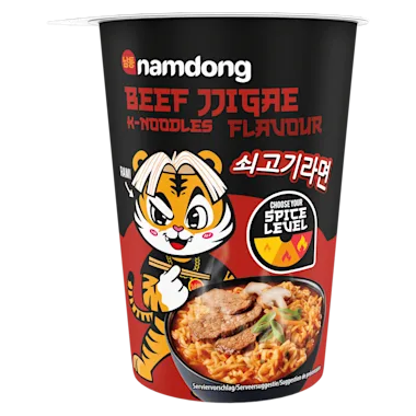 Met Namdong Beef Jjigae Noodle Cup geniet je van de smaak van Korea. Leuk weetje: 'jjigae' betekent stoofpot in het Koreaans. Eet jij dit stoofpotje met rundsmaak graag pittig of liever mild? Met Namdong-noedels is de keuze aan jou! Ga voor superpittige noodles met het hele zakje chilipeper, of laat het zakje achterwege en geniet van de smaak zonder chili. Probeer je graag eens iets nieuws en voel je je moedig, gebruik dan de helft van het zakje voor een beetje extra pit!