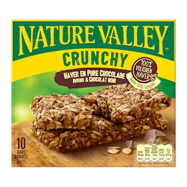 Varieer voor nog meer plezier en ontdek ook: Nature Valley™ graanreep pinda & chocolade en Nature Valley™ graanreep gezouten karamelnoten. We halen sinds 1975 onze inspiratie uit de natuur. Al onze repen zijn bereid met heerlijke smaakvolle ingrediënten, zoals natuurlijke haver en honing. Of je nu wandelt in het bos of fietst op het platteland, beleef het leven op de Nature Valley™ manier! Boordevol natuurlijke volkoren haver en een vleugje heerlijke pure chocolade, Nature Valley™ CRUNCHY HAVER EN PURE CHOCOLADE -repen zijn het perfecte tussendoortje voor onderweg, precies wanneer je trek krijgt. De natuur heeft zoveel te bieden, daarom zitten er twee heerlijke repen in één verpakking, zodat je alles uit je dag haalt. 100% volkoren haver. Geen kleurstoffen. Geen conserveringsmiddelen. Lactosevrij.