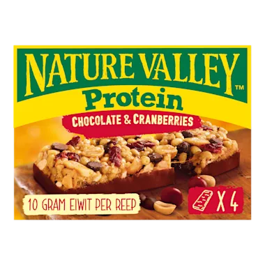 Proteïnereep met pinda's, chocoladestukjes en gezoete gedroogde cranberry's, gedoopt in een chocoladesmaak coating.