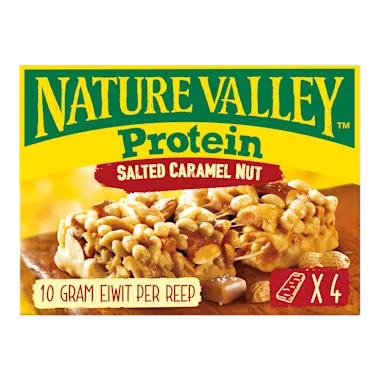 We halen sinds 1975 onze inspiratie uit de natuur. Al onze repen zijn bereid met heerlijke smaakvolle ingrediënten, zoals natuurlijke pinda's en amandelen. Of je nu wandelt in het bos of fietst op het platteland, beleef het leven op de Nature Valley™ manier! Wanneer je trek krijgt neem dan een Nature Valley™ Protein Gezouten Karamelnotenreep. Deze bevat 20% van je dagelijkse aanbevolen Karamelnotenreep hoeveelheid eiwitten en 5 gram vezels. Deze glutenvrije snack bevat 40 gram zorgvuldig geselecteerde ingrediënten, zoals pinda’s en amandelen met vleugje heerlijke geharde karamel, die er een geweldige on-the-go snack van maken voor je volgende avontuur. Geen kunstmatige kleurstoffen. Geen conserveermiddelen. Glutenvrij.