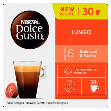 Ontdek de XL verpakking NESCAFÉ® Dolce Gusto® Lungo, intense volle medium-dark roast koffiecups. met krachtige aroma's en een rijke cremalaag. Geniet van de complexe smaak van koffie met een subtiele hint van zwarte bessen.