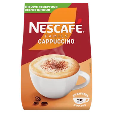 Nescafe family cappuccino is een heerlijke cappuccino oploskoffie met een volle melkschuimlaag. Gemaakt van verantwoord geteelde koffiebonen.