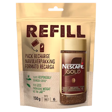 NESCAFÉ Gold is een Premium oploskoffie, nu verkrijgbaar in een handige navulzak! Geef je NESCAFÉ Pot een tweede leven en geniet van (h)eerlijke koffie op een duurzamere manier. Aan deze NESCAFÉ Gold zijn nu fijngemalen arabica koffiebonen toegevoegd, waardoor de zachte smaak en het rijke aroma nog beter vrijkomen.