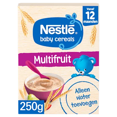 Met Nestlé baby cereals Multifruit geef je altijd een verantwoord. lekker en compleet ontbijtje. Omdat de pap al melk bevat. hoef je er alleen nog maar water aan toe te voegen. Lekker makkelijk!