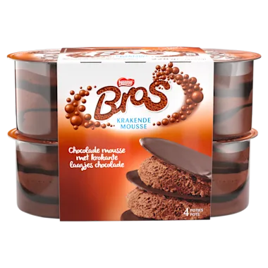 Melkmousse met chocolade (91,2%)en fijne cacaoblaadjes (8,8%).