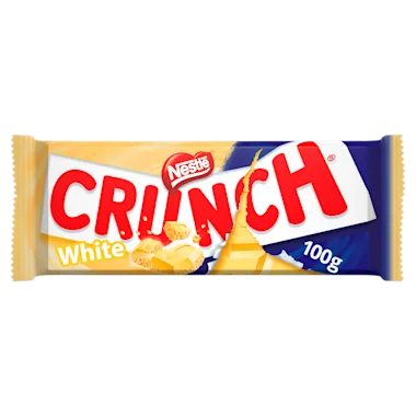 NESTLÉ CRUNCH is een romige, witte chocoladereep met een verrassende bite door de krokante glutenvrije granen.