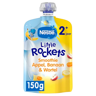 NESTLÉ Little Rockets Smoothie Appel, Banaan & Wortel is een lekker en verantwoord tussendoortje, zonder toegevoegde suikers¹. In een handige portieverpakking van 150g, speciaal afgestemd op peuters. ¹Bevat alleen van nature aanwezige suikers