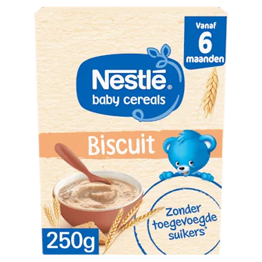 NESTLÉ baby cereals Biscuit is een lekker. verantwoord en compleet papje. Omdat de pap al melk bevat. hoef je er alleen nog maar water aan toe te voegen. Lekker makkelijk!