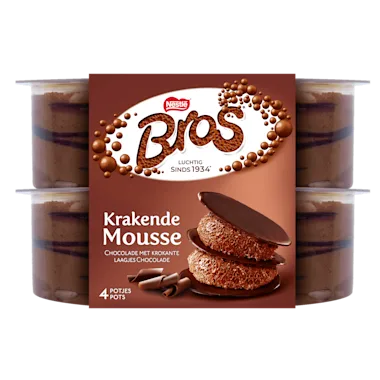 Melkmousse met chocolade (91,2%)en fijne cacaoblaadjes (8,8%).