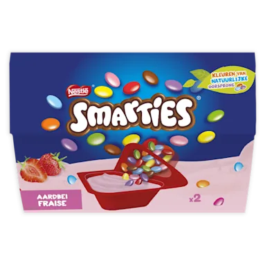 Ingrediënten: Yoghurt met aardbei, gesuikerd (83,3%): Yoghurt (MELK) (70,8%), suiker (6,0%), aardbeien (4,6%), fructose, rijstzetmeel, concentraat van MELKmineralen, aroma, rode bietensap concentraat, vitamine D. Ingrediënten: Melkchocolade in een krokant laagje (16,7 %): Suiker, cacaoboter, magere MELKpoeder, cacaomassa, weipoeder (MELK), tarwebloem (GLUTEN), boterconcentraat (MELK), rijstezetmeel, emulgator (zonnebloemlecithine), fruit- en plantenconcentraten (saffloer, radijs, zwarte wortel, hibiscus, citroen), spirulinaconcentraat, glansmiddelen (bijenwas, carnaubawas), natuurlijk vanillearoma, invertsuikerstroop. [Mogelijke sporen van PINDA, EIEREN, SOJA, SESAM, NOTEN].