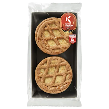 Ingrediënten :Suiker, TARWEBLOEM, roomboter (MELK), plantaardige oliën (palm, raapzaad, kokos), SOJABOON, water, gemodificeerd aardappelzetmeel, 4% speculaaskruiden (kaneel, kruidnagel, gember, nootmuskaat, piment, korianderzaad, foelie, kardemom), dextrose, invertsuikerstroop, TARWEMEEL, zout, citrusvezel, emulgator: E471, stabilisator: sobitolen, SCHARRELKIPPENEI-EIGEEL, rijsmiddel: E450/E500, verdikkingsmiddel: pectinen/guarpitmeel, AMANDELEN, glucosestroop, abrikozenpitten, natuurlijk aroma, kleurstof: carotenen, aroma’s, zuurteregelaar: citroenzuur, TARWEZETMEEL, aardappelzetmeel.