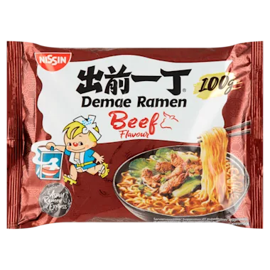 Ingrediënten: noedels 90,9% [TARWEMEEL, palmolie, zout, meelverbeteraars (natriumcarbonaat, trifosfaten), stabilisator (kaliumcarbonaat), verdikkingsmiddel (guarpitmeel), antioxidant (tocoferolrijk extract)], kruidenpoeder 7,3% [zout, smaakversterkers (moninatriumglutamaat, dinatriumguanylaat, dinatriuminosinaat), sojasauspoeder (SOJABONEN, TARWE, zout, maltodextrine), suiker, dextrose, rundvleesaroma's (bevat TARWE, SOJA), specerijen (bevat SELDERIJ), rundvleesextractpoeder (maltodextrine, rundvleesextract), kleurstof (ammoniakkaramel), prei, roompoeder (gluosestroop, palmolie, MELKEIWITTEN), gistextract, raapzaadolie, antiklontermiddel (siliciumdioxide), rundervetpoeder (rundervet, rundvleesextract), zuurteregelaar (citroenzuur)], kruidenolie 1,8% (rundervet, rapzaadolie, aroma). Kan sporen bevatten van SCHAALDIEREN, VIS, WEEKDIEREN, MOSTERD en SESAM.