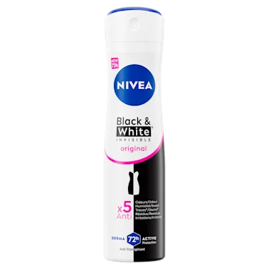 NIVEA Black & White Invisible Original biedt bescherming tegen witte strepen op zwarte kleding en tegen gele vlekken op witte kleding dankzij de unieke, gepatenteerde anti-vlektechnologie. Het biedt betrouwbare 72 uur anti-transpirant bescherming, is sterk tegen zweet en geuren en verzorgt tegelijkertijd je huid. De formules zijn dermatologisch bewezen huidvriendelijk en bevatten geen ethylalcohol. NIVEA Black & White biedt volledige bescherming tegen zweet, geuren, vlekken, resten en irritaties, terwijl het zacht is voor de huid.