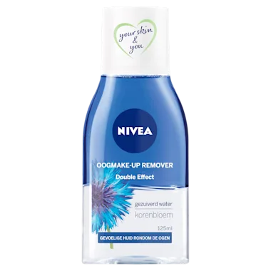 NIVEA Double Effect Waterproof Oogmake-Up Remover 125ml verwijdert waterproof make-up & mascara en verzorgt je wimpers. Het gevoelige ooggebied wordt efficiënt maar zeer mild gereinigd. Bifase formule met korenbloem en biotine. De fles is gemaakt van 96% gerecycled materiaal - labels, dop & insert uitgezonderd. Oogvriendelijkheid oftalmologisch goedgekeurd.
