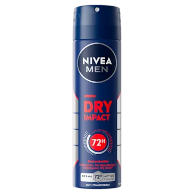 NIVEA MEN Dry Impact Anti-Transpirant biedt betrouwbare 72 uur bescherming en verzorgt je huid, allemaal zonder ethylalcohol. Dermatologisch getest op huidverdraagzaamheid. Onze anti-transpiranten bieden Derma 72h Active Protection: ze werken samen met de huid en bieden betrouwbare en krachtige bescherming tegen zweet en geur, met huidvriendelijke formules.