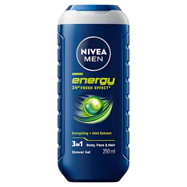 NIVEA MEN Energy Douchegel 250 ml voor mannen die een energieboost willen onder de douche met intensieve verzorging voor de huid. De 3-in-1 douchegel voor lichaam, gezicht en haar met activerend mint-extract is de beste manier om je lichaam en geest een energy boost te geven. Geef jezelf nieuwe energie na elke douche. Ph Huidneutraal en huidvriendelijkheid dermatologisch goedgekeurd.