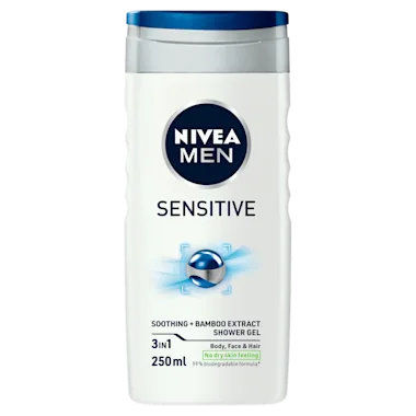 NIVEA MEN Sensitive douchegel 250ml voor mannen die een verzachtende douche willen met een intensieve verzorging van de gevoelige huid. De 3-in-1 douchegel voor lichaam, gezicht en haar is de beste manier om je huid te verzachten. Voor een voelbaar zachte huid na elke douche. De formule is 99% biologisch afbreekbaar * en de fles is gemaakt van tot wel 97% gerecycled materiaal **