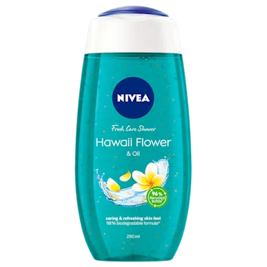 NIVEA Hawaii Flower & Oil Douchegel 250ml zorgt voor een onmiddellijk verfrissend huidgevoel. Deze douchegel met vitamine C, E & olieparels beschermt en verzorgt de huid op natuurlijke wijze. NIVEA's douchegel voor iedere dag maakt van je douchebeurt een verfrissende ervaring. De kalmerende Hawaii Flower-geur biedt de huid een gehydrateerd en gezond huidgevoel.
