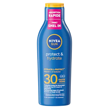 NIVEA SUN Protect & Hydrate Lotion met CitraCell-ProtectTM met vitamine C & Hyaluron. De nieuwe CitraCell-ProtectTM formule gaat verder dan UV-filters. Het vormt een tweede beschermingslaag van de huid en vermindert effectief de oxidatieve stress van de huid op cellulair niveau. De nieuwe formule houdt daarnaast de huid gehydrateerd voor 48 uur* voor een gezond, zacht huidgevoel. *Instrumentele test, 43 vrijwilligers