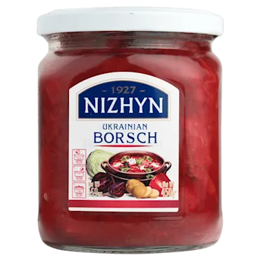 Ingrediënten; rode bieten 32%, witte kool 18%, aardappel 15%, paprika 3%, tomatenpuree, wortelen, uien, zonnebloemolie, suiker, zout, zuurteregelaar (citroenzuur), zwarte peper, laurierblad.