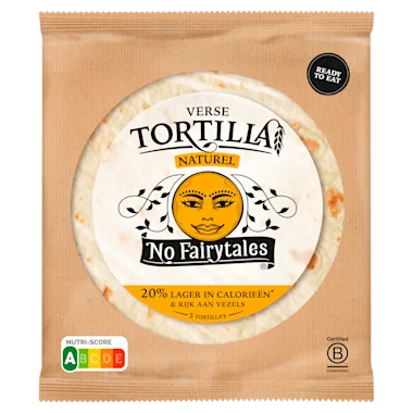 20% lager in calorieën* & rijk aan vezels * 20% minder calorieen dan de gemiddelde naturel tortilla. Waarom kiezen tussen lekker en gezond als het allebei kan? Deze verse tortilla is gemaakt met 35% groenten - ja, echt. Dat zorgt voor minder calorieën, meer vezels en een heerlijk ambachtelijke smaak. Vergelijk dat eens met een gewone witte tortilla uit je voorraadkast... Onze verse tortilla daarentegen? Ruikt alsof 'ie net uit de oven komt en is zo lekker dat je 'm zonder vulling al wilt opeten. Perfect voor de lunch of welk moment je maar kiest. Bij No Fairytales maken we gezond eten zó lekker, dat je nooit meer terug wilt naar gewoon.