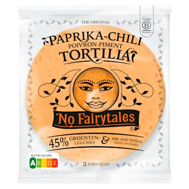 De enige echte paprika-chilitortilla, vers te vinden in het koelschap. De kleurrijke groentetortilla's van No Fairytales bevatten een flinke hoeveelheid groenten. Dat is gemakkelijk een stapje beter. - Vers in het koelschap - Gemaakt met 45% groenten en een bron van vezels - Een verpakking bevat 5 groentetortilla’s met per stuk slechts 99 kcal - Lekker voor bij de lunch, borrel, of avondeten Extra informatie: Maak er een tuna melt panini van! Beleg de paprika-chilitortilla’s met tonijnsalade, Chinese kool, en cheddar. Bak ze een paar minuutjes in een tosti-ijzer en klaar is kees!