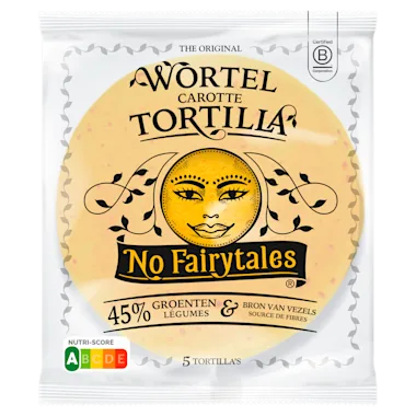 De enige echte worteltortilla, vers te vinden in het koelschap. De kleurrijke groentetortilla's van No Fairytales bevatten een flinke hoeveelheid groenten. Dat is gemakkelijk een stapje beter. - Vers in het koelschap - Gemaakt met 45% groenten en een bron van vezels - Een verpakking bevat 5 groentetortilla’s met per stuk slechts 99 kcal - Lekker voor bij de lunch, borrel, of avondeten Extra informatie: Maak er een tortizza van! Bestrijk de worteltortilla met tomatensaus en beleg met champignons, mascarpone, mozzarella, serranoham, en rucola. Doe de tortilla 5-7 minuten in de oven en klaar is kees!