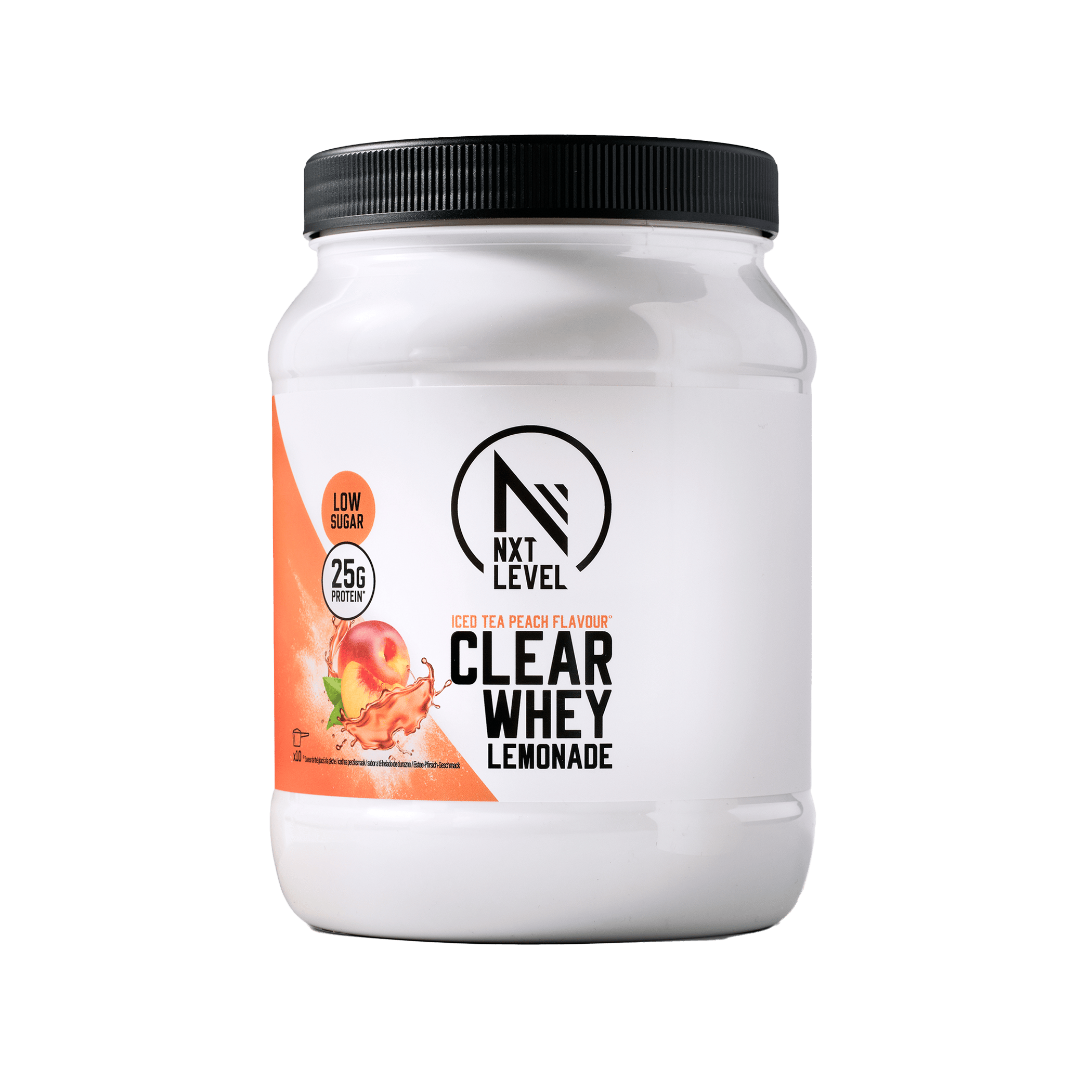 Eiwitpoeder met ijsthee perziksmaak en zoetstofffen.