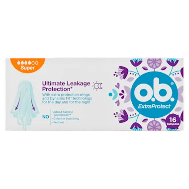 De o.b.® ExtraProtect Super-tampons voor zwaardere menstruatiedagen combineren twee toonaangevende tampontechnologieën en bieden de ultieme bescherming tegen lekken (binnen het o.b.®-assortiment). De extra beschermingsvleugels ontplooien zich voorzichtig om vocht op te vangen dat bij gewone tampons soms ontsnapt. De unieke Dynamic Fit™-technologie met gebogen helpt het vocht efficiënt verdelen in de kern van de tampon. Bovendien zijn de o.b.® ExtraProtect-tampons gynaecologisch getest, bevatten een 100% plantaardige kern en zijn vrij van schadelijke chemicaliën (bv. pesticiden), chloorbleekmiddel en parfum.