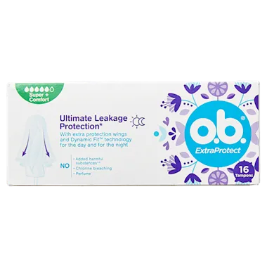 De o.b.® ExtraProtect Super Plus-tampons voor zeer zware menstruatiedagen combineren twee toonaangevende tampontechnologieën en bieden de ultieme bescherming tegen lekken (binnen het o.b.®-assortiment). De extra beschermingsvleugels ontplooien zich voorzichtig om vocht op te vangen dat bij gewone tampons soms ontsnapt. De unieke Dynamic Fit™-technologie met gebogen groeven helpt het vocht efficiënt verdelen in de kern van de tampon. Bovendien zijn de o.b.® ExtraProtect-tampons gynaecologisch getest, bevatten een 100% plantaardige kern en zijn vrij van schadelijke chemicaliën (bv. pesticiden), chloorbleekmiddel en parfum.