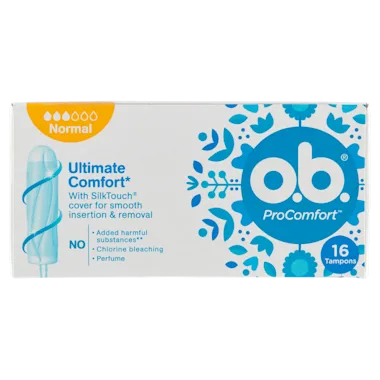 o.b.® ProComfort® Normal tampons met Dynamic Fit™ -technologie en SilkTouch®-oppervlak zorgen voor ultiem comfort* en betrouwbare bescherming voor de gemiddelde tot zware dagen van uw menstruatie (* binnen het o.b.®-assortiment). De Dynamic Fit-technologie met 3D-expansie zorgt ervoor dat de tampon zich op een natuurlijke wijze naar het lichaam vormt en de unieke in elkaar overlopende groeven helpen de vloeistof naar de kern van de tampon te leiden. Met SilkTouch oppervlak voor probleemloos inbrengen en verwijderen. De tampons zijn gynaecologisch getest, hebben een kern die 100% plantaardig is, zonder schadelijke chemische stoffen (o.a. pesticiden). o.b.® ProComfort® Normal tampons zijn chloor- en parfumvrij.