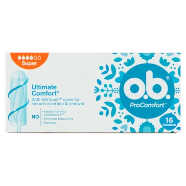 o.b.® ProComfort® Super Tampons met Dynamic Fit™ -technologie en SilkTouch®-oppervlak zorgen voor ultiem comfort* en betrouwbare bescherming voor de zwaardere dagen van uw menstruatie (* binnen het o.b.®-assortiment). De Dynamic Fit-technologie met 3D-expansie zorgt ervoor dat de tampon zich op een natuurlijke wijze naar het lichaam vormt en de unieke in elkaar overlopende groeven helpen de vloeistof naar de kern van de tampon te leiden. Met SilkTouch oppervlak voor probleemloos inbrengen en verwijderen. De tampons zijn gynaecologisch getest, hebben een kern die 100% plantaardig is, zonder schadelijke chemische stoffen (o.a. pesticiden). o.b.® ProComfort® Super tampons zijn chloor- en parfumvrij.