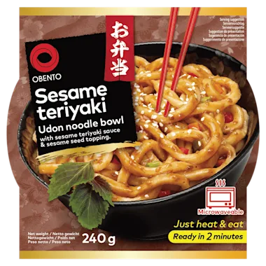 Ingrediënten: Noedels (78.3%): water, TARWEbloem, gemodificeerde tapiocazetmeel, zout, zuurteregelaar (E270). Sesam teriyakisaus (20%): suiker, SOJAsaus (water, TARWE, SOJA, zout), rijstwijn, (rijst, water), water, gember, SOJABONENpasta (water, SOJA, zout), knoflook, geconcentreerde citrusstroop, (water, suiker, geconcentreerd appelsap, geconcentreerd citroensap, stabilisator (E466), zuurteregelaar (E330), verdikkingsmiddel (E412, E440), antioxidant (E300)), gemodificeerde maïszetmeel, SESAMpasta (0.3%), SOJAolie, zout, gistextract, specerijen, SESAMolie (0.16%), zuurteregelaar (E330). Gedehydrateerde groenten (0.8%): gedroogde wortel, gedroogde paprika, gedroogde lente-ui. Garnering (0.8%): geroosterde SESAMzaadjes.