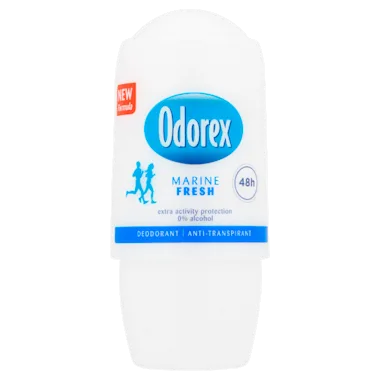 Odorex Marine Fresh anti-transpirant bevat een frisse en coole geur en beschermt 48 uur lang tegen transpiratie.