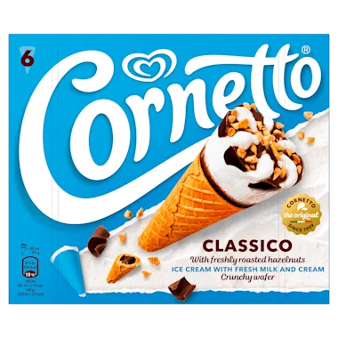 Cornetto Classico IJs: het enige echte ijshoorntje van Cornetto uit Italië! De Cornetto Classico met verbeterd Italiaans recept is nu nog beter van smaak met verse melk en room van topkwaliteit en nog meer vers geroosterde nootjes. Heerlijk vanille-roomijs bedekt met krokante chocolade en knapperige nootjes... en natuurlijk het welbekende chocoladepuntje in een heerlijk krokant wafelhoorntje. In deze handige uitdeelverpakking zitten 6 ijsjes, die je perfect met elkaar kan delen. Bij Cornetto is iedere hap een genot, omdat we vinden dat onze ingrediënten goed van smaak en kwaliteit moeten zijn. Toch is de Cornetto Classico verder vooral hetzelfde gebleven. Waarom zou je veel veranderen aan iets wat al zo lekker is? De Cornetto Classico IJs heeft dan ook nog steeds zijn geliefde smaak en vertrouwde charme. Bovendien zijn de individuele verpakkingen van Cornetto ook nog eens ideaal voor feestjes of voor een dag op het strand.