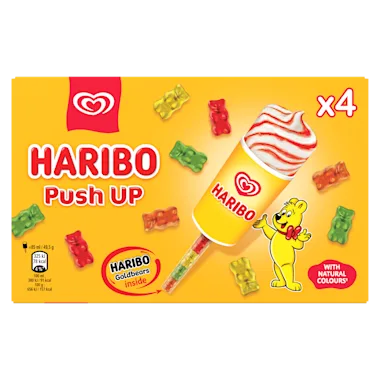 Ola Haribo Push-Up IJs is een mix van fruitige, zoete en romige smaken Vanille-ijs met aardbeiensaus, met fruitige gummibeertjes in het stokje Een ijsje met vrolijke kleuren en lekkere smaken waar iedereen dol op is IJs en gummibeertjes gemaakt met natuurlijke kleur- en smaakstoffen In een doos met 4 ijsjes om alleen óf met anderen van te genieten Bewaar de ijsjes koel en donker bij -18 °C