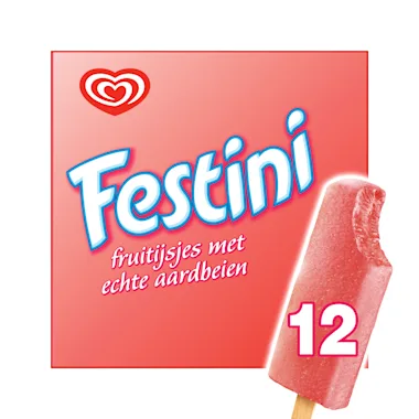 OLA Festini Aardbei Waterijs is een heerlijk ijsje met de fruitige smaak van aardbei. Dat is simpel genieten. De Festini Aardbei is al jaren een absolute favoriet onder ijsliefhebbers en dat is ook niet zo gek. De Festini fruitijsjes, met echte aardbeien en zonder kunstmatige kleur- en smaakstoffen, bevatten 23% van de aanbevolen dagelijkse hoeveelheid vitamine C en zijn met maar 40 calorieën per ijsje een heel puur en fruitig ijsje. Perfect ijs voor bij warme temperaturen, op vakantie, in je eigen tuin, als nagerecht, tussendoortje, toetje, onderweg of voor bij een leuke film. Daarnaast is de Festini ook verkrijgbaar in de smaak peer.