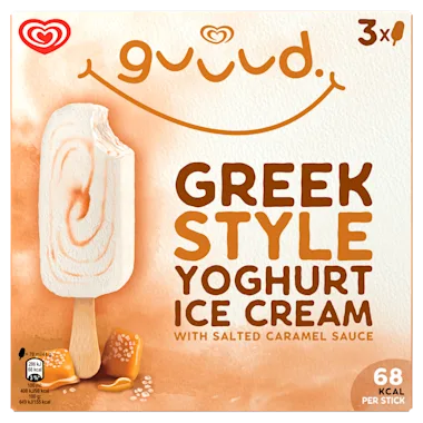 Ola Guuud Greek Style Yoghurt Salted Caramel IJs is een yoghurtijsje bereid met Griekse stijl magere yoghurt en een gezouten karamelsaus. Bij Guuud geloven we dat smaak alles is en daarom streven we ernaar om jou alle verwennerij te bieden die ijs zou moeten zijn. Ons heerlijke Griekse yoghurtijs combineert een rijke en romige textuur met een heerlijke saus, een geweldige manier om te genieten. Lekker, zonder enig compromis. Het ijsje telt slechts 68 kcal per stuk.