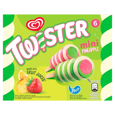 Ola Mini Twister Pineapple IJs: ananas-ijs gemaakt op plantaardige basis en gemaakt met echt fruitsap, is een verdraaid fruitig waterijsje met frisse fruitsmaken. Het is heerlijk waterijs met de smaak van ananas, aardbei, citroen en limoen. Het ijsje heeft een unieke vorm, verfrissende kleuren en is gemaakt voor jong en oud. Deze Ola Twister Pineapple ijsjes zijn een feestje om mee thuis te komen en een traktatie voor het hele gezin, familie en vrienden. Een heerlijke, verfrissende traktatie voor op een warme zomerdag! Elke Ola Twister Mini Pineapple bevat 39 kilocalorieën en is gemaakt met natuurlijke aroma's en kleurstoffen van natuurlijke oorsprong. Daarnaast is het ijsje gemaakt volgens de "Verantwoord Gemaakt Voor Kinderen - Responsibly Made for Kids" richtlijnen van Ola. De handige uitdeeldoos bevat 6 Mini Twister Pineapple ijsjes van 50 ml, ideaal om uit te delen. Met de fruitige Twister Pineapple waterijsjes maak je overal een feestje van!