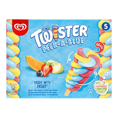 OLA Twister Peek-a-Blue is een verdraaid lekker waterijsje, gemaakt met fruit. De Twister Peek-a-Blue is heerlijk waterijs met de smaak van meloen, aardbei-citroen en appel-bosbes. Het ijsje heeft een unieke vorm, verfrissende kleuren en is gemaakt voor jong en oud. Gebaseerd op OLA's klassiekers de mini Twister en de Super Twister. Elke Twister Peek-a-Blue bevat 66 kilocalorieën en is gemaakt met natuurlijke kleur- en smaakstoffen. Daarnaast is het ijsje gemaakt volgens OLA's "Responsibly Made for Kids" - "verantwoord gemaakt voor kinderen"-richtlijnen.